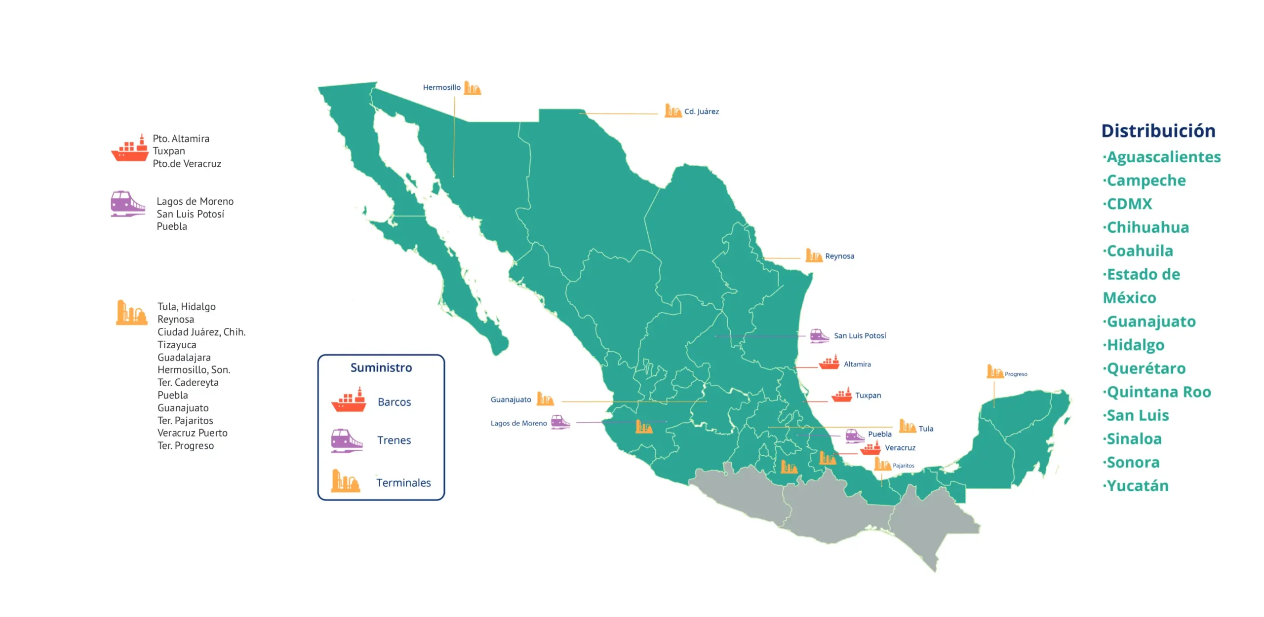 del país con servicios integrales en la distribución terrestre y marítima, así como convenios con terminales terrestres y marítimas.